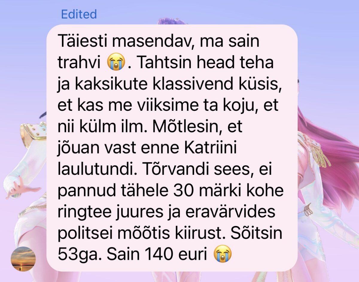 Ka meie pere meespool sai nädal enne jõule trahvikingituse. Sarnaselt ei märganud, et oli 30 alas ja sõitis 50ga. Vastu vaatas küll puhas leht, aga see ei aidanud, koju tuli 600-eurose trahviviitungiga. Nädal enne jõule .. võttis ikka mõruks selle tuju küll 🙁